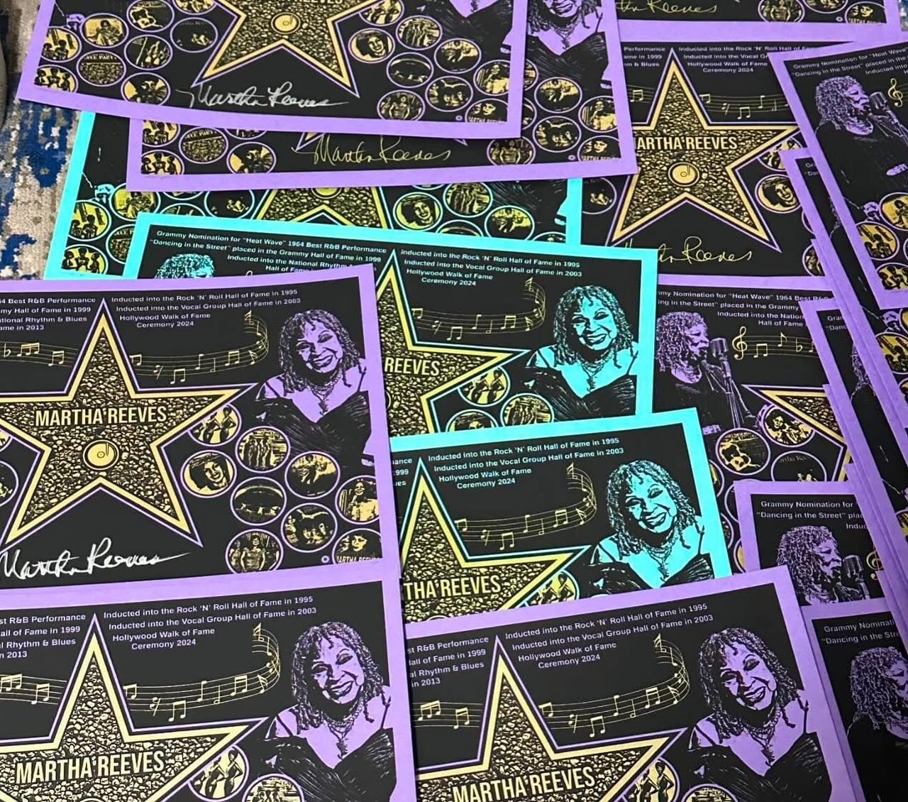 Martha has personally signed these limited edition art prints. They come in two color styles. They are hand signed and numbered by Martha and the artist. These beautiful prints reflect Martha, and Martha Reeves and the Vandellas’ albums and accomplishments and celebrate Martha’s recent Hollywood Walk of Fame recognition. There’s just a small quantity remaining. These lovely prints have been reduced to $40.00. Get them while they last.